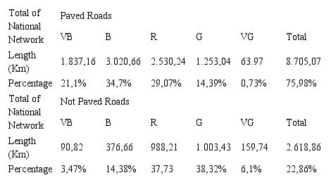 Total of National Network Paved Roads VB B R G VG Total Length (Km) 1.837,16 3.020,66 2.530,24 1.253,04 63.97 8.705,07 Percentage 21,1% 34,7% 29,07% 14,39% 0,73% 75,98% Total of National Network Not Paved Roads VB B R G VG Total Length (Km) 90,82 376,66 988,21 1.003,43 159,74 2.618,86 Percentage 3,47% 14,38% 37,73 38,32% 6,1% 22,86% Importar tabla