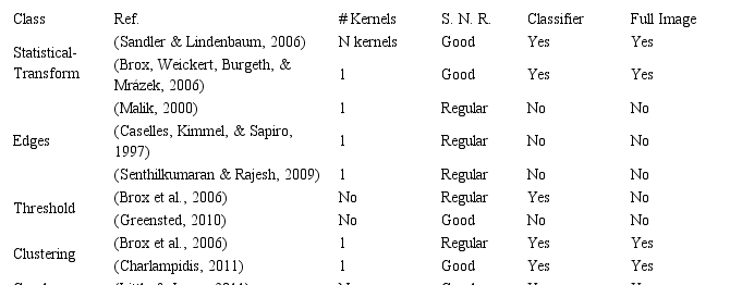 Class Ref. # Kernels S. N. R. Classifier Full Image Statistical- Transform (Sandler & Lindenbaum, 2006) N kernels Good Yes Yes (Brox, Weickert, Burgeth, & Mrázek, 2006) 1 Good Yes Yes Edges (Malik, 2000) 1 Regular No No (Caselles, Kimmel, & Sapiro, 1997) 1 Regular No No (Senthilkumaran & Rajesh, 2009) 1 Regular No No Threshold (Brox et al., 2006) No Regular Yes No (Greensted, 2010) No Good No No Clustering (Brox et al., 2006) 1 Regular Yes Yes (Charlampidis, 2011) 1 Good Yes Yes Graph (Little & Jones, 2011) No Good Yes Yes Importar tabla
