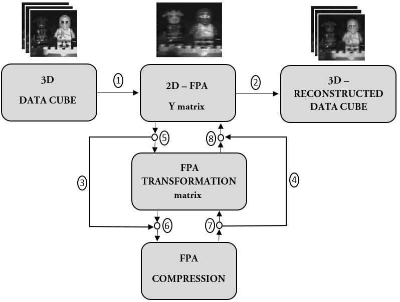 FPA projections can be additionally compressed using transformation techniques. The more similar the statistical distribution and the correlation between the FPA data with the hyperspectral data cube, the higher the compression ratio (Li, Xiong, Arguello, & Arce, 2014). In all the presented CSI architectures, sampling aperture that filters the input image has a known structure.