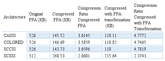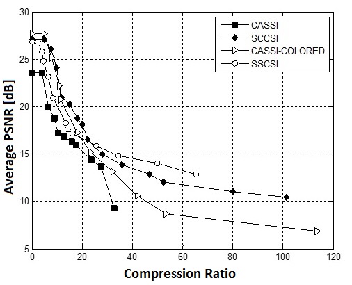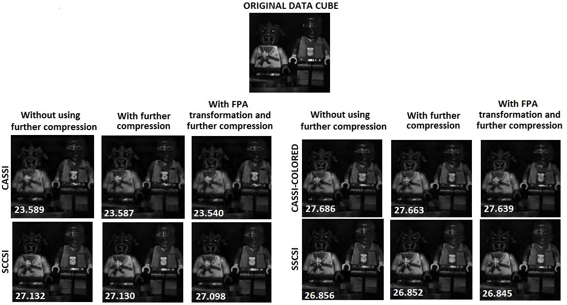 Each of the mentioned architectures were tested with a data cube of 256 X 256 X 8 voxels. This data cube corresponds to a hyperspectral image with 8 spectral bands. The SCI algorithms have random coded apertures of filters depending on the architecture. However, in order to compare results between the process with and without further compression, a fixed coded aperture was used in all the simulations. For the calculations, the size of the matrix Y was obtained by taking into account that each FPA pixel was represented with 64 bits in MATLAB.