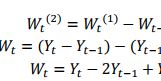 (1)Donde φ corresponde al coeficiente autorregresivo a determinar, θ coeficiente de media móvil a determinar, ε término de error y Yt-p es el registro normalizado de la serie a modelar. Para el término del diferencial se debe considerar una evaluación del orden. Los diferenciales pueden ser de primer o segundo orden, siguiendo la forma mostrada en las ecuaciones (2) y (3) respectivamente.