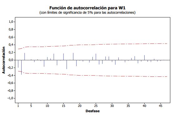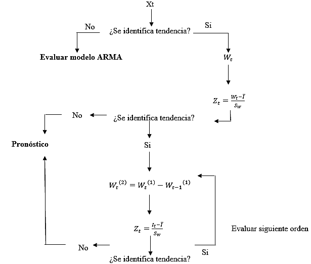 (4)Donde Wt es el término diferenciador, Yt se refiere al registro de la serie normalizado en el tiempo t, el término Zt se refiere al dato del registro estandarizado en el tiempo t y se obtiene de la ecuación (4), promedio de los registros diferenciados, SW desviación estándar del registro diferenciado. La metodología de determinación de un ARIMA se muestra en la figura 1.