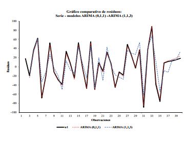 A partir de estos resultados, se realiza la verificación del comportamiento de los residuos de los dos modelos que presentan mayor significancia estadística. Este proceso se lleva a cabo mediante la comparación de los modelos seleccionados y el registro real diferenciado. En la figura 9 se observa que el modelo que mejor ajusta al registro real es el modelo ARIMA (0, 1, 1), indicando un modelo de media móvil de orden 1 con tendencia. Este sigue la forma descrita en la ecuación (5).
