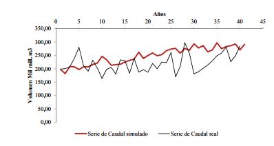 Conclusions: The simulated results obtained with the ARIMA model compared to the observed data showed a fairly good adjustment of the minimum and maximum magnitudes. This allows concluding that it is a good tool for estimating minimum and maximum volumes, even though this model is not capable of simulating the exact behaviour of an annual volume time series.