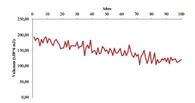 La figura 11 muestra la simulación de la serie en un rango más amplio (100 años) pronosticando un volumen mínimo del río Magdalena de 106 millones de m3 en 100 años. Esto permite considerar planes de acción a futuro para disminuir la tasa de escasez. Sin embargo, cabe destacar que estos modelos van ligados a los registros de volumen o de niveles disponibles, por tanto, se debe actualizar el modelo año a año para obtener una aproximación más exacta.