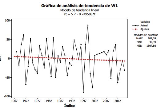 A partir de los registros históricos de volumen anual del río Magdalena, se realizó un análisis preliminar que permitió tener una idea general del tipo de modelo que podría ajustar mejor a la serie. Como primera medida se elaboró un gráfico de los registros del río en el tiempo para verificar su comportamiento (figura 2). El análisis preliminar permite detectar la necesidad de estabilizar la varianza y la media.