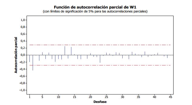 Posteriormente, se analizaron estadísticamente los registros anuales del río Magdalena, mediante la función de autocorrelación (ACF) y función de autocorrelación parcial (PACF). La finalidad de este procedimiento es llevar a cabo un análisis preliminar visual y estadístico que permita identificar un modelo con el mejor ajuste. Para cada función se analizaron 45 desfases. Gráficamente puede observarse que la función de ACF (figura 4) muestra dos barras que sobresalen en el primer segundo desfase con valores ACF de -0,198 (t estadístico: -1,37) y -0,381 (t estadístico: -2,54), demostrando la representatividad únicamente del segundo desfase. Por su parte, la PACF muestra dos barras sobresalientes en el primer y segundo desfase con un valor de PACF de -0.198 (t estadístico: -1,37) y -0,4377 (t estadístico: -3,03) respectivamente. La figura 5 muestra las dos barras sobresalientes en los desfases iniciales que decaen hacia cero, lo cual puede indicar una importante influencia del proceso de promedios móviles MA.