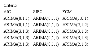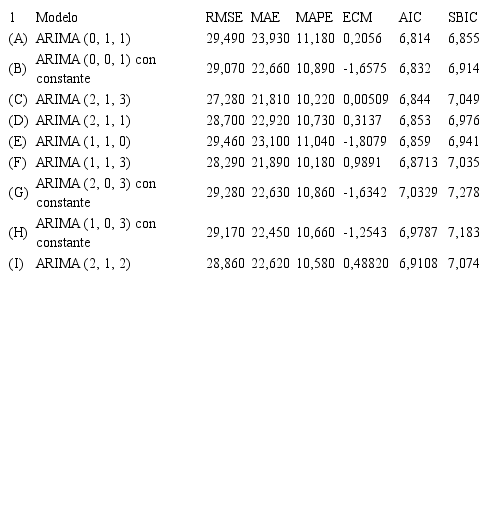 Después de ver el comportamiento de la serie, se realizan análisis complementarios con el fin de considerar los criterios de información de Akaike (AIC), criterio de Schwarz (SBIC), el error porcentual absoluto medio (MAPE) y criterio de error cuadrático medio (ECM) (tabla 1). Este análisis permitió seleccionar modelos entre un conjunto finito de modelos basados en la función de probabilidad (Mauricio, 2007), adicionando un término de penalización para el número de parámetros en el modelo, para evitar un sobreajuste en este.