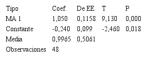 Los estimados finales de los parámetros para el modelo ARIMA (0, 1, 1), muestran que los residuos cuentan con un proceso aleatorio siguiendo una tendencia normal, media cero, con una ligera tendencia hacia el lado derecho de los ajustes (figura 6). Por otra parte, se destaca la significancia estadística del modelo, dado por el test-t mayor a 1,96 y el P-value menor a 0,05 (tabla 3).
