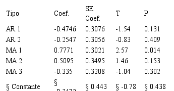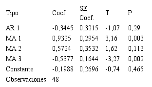 Los estimados finales de los parámetros para el modelo ARIMA (1, 1, 3) indican que los residuos siguen una tendencia normal, los valores ajustados siguen un proceso aleatorio, mostrando mayor dispersión que el modelo ARIMA (0, 1, 1). Sin embargo, los residuos no presentan una simetría (figura 6). Igualmente se destaca la significancia estadística de todos los parámetros del modelo (MA1 y MA 3), los cuales presentan mayores valores del test-t (tabla 4) para un nivel de confianza mayor al 95 %.