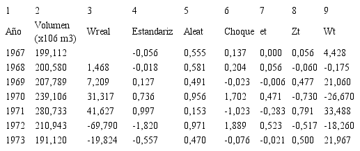 En la tabla 6 se resumen los parámetros considerados en la simulación. La columna 1 y 2 es de carácter informativo, allí se detallan los registros reales de la serie. La columna 3 muestra los datos diferenciados de la serie real obtenidos a partir de la ecuación (2). La columna 4 plantea la estandarización de los datos diferenciados, calculados a partir de la ecuación (4). La columna 5 presenta datos aleatorios generados con Excel (en total se generaron 100) que permitieran la generación de la serie sintética de 100 años. Las columnas 6 y 7 representan los términos del ruido blanco. La columna 6 presenta el choque, que no es más que el inverso de la distribución normal estándar acumulada, la cual tiene una media de cero y una desviación estándar de uno (aplicación recomendada realizarla en Excel para términos prácticos) necesario para calcular el error o ruido blanco de la ecuación (1) y ecuación (5). En la columna 7 se indica la estimación del ruido blanco calculada como: choque (columna 6) * , para esta ecuación se utilizó el valor de θ1 calculado en el ítem anterior pata el modelo ARIMA (0, 1, 1) θ1 = 1,05. La columna 8 indica la solución del modelo MA dado por la segunda parte ecuación (5). La columna 9 muestra la diferenciación de la serie simulada calculada despejando Wt de la ecuación (4).