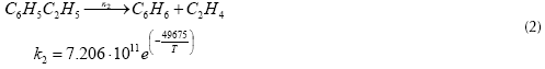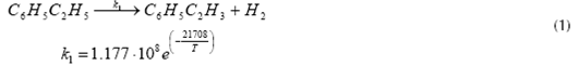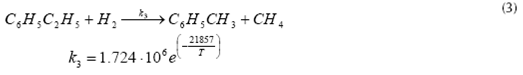 Equations (1) (2) and (3) represent the main reactions that take place inside the Catalytic Reactor, which are the catalytic dehydrogenation of ethyl-benzene to obtain styrene and hydrogen (equation 1); benzene and toluene formation from ethyl-benzene (equation 2); and the reaction of ethyl-benzene with hydrogen to obtain toluene and methane (equation 3). The application of high temperatures during reaction step permits the catalytic dehydrogenation of ethyl-benzene to be the predominant reaction, with a selectivity of about 95% (Snyder & Subramaniam, 1994) while the rest of the reactions involved totalize about 4%. The most important reactions occurring inside the reactor, as well as its reaction kinetics, are shown below (Snyder & Subramaniam, 1994) (WVU, 2010).