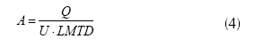 Where Q is the exchanged heat [kcal/h] and U is the overall heat transfer coefficient [kcal/h.m2.ºC]. According to this expression, the greater the value of the numerator (Q), the greater the result of the heat transfer area (A) (Cao, 2010).