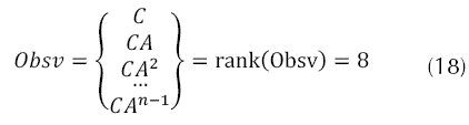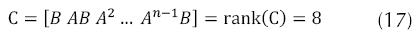 El sistema de control es completamente controlable, si es posible transferir al sistema del quadrotor desde un estado inicial arbitrario siempre y cuando este en la vecindad en torno al punto de equilibrio a cualquier estado deseado en un tiempo finito, en el cual aplicando la siguiente expresión que intervienen las matrices de estados, ecuaciones (11) y (13). Se puede observar gracias a la ecuación (17) que el índice de controlabilidad generado por el rango de la matriz C, corresponde al mismo orden del número de estados del sistema, que prácticamente informa que la planta a controlar es completamente controlable.