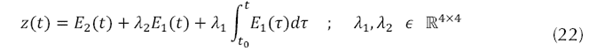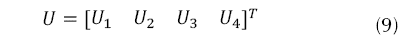 Considerando el vector de estados x(t) presente en la ecuación (7) con sus variables respectivas dadas por la ecuación (8), y el vector de entrada U, presentado en la ecuación (9), donde las entradas son mapeadas como se indica en la ecuación (10).