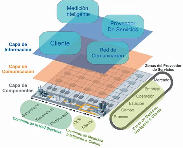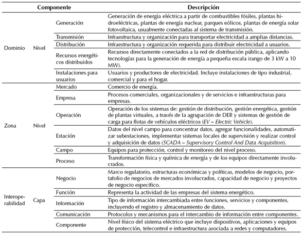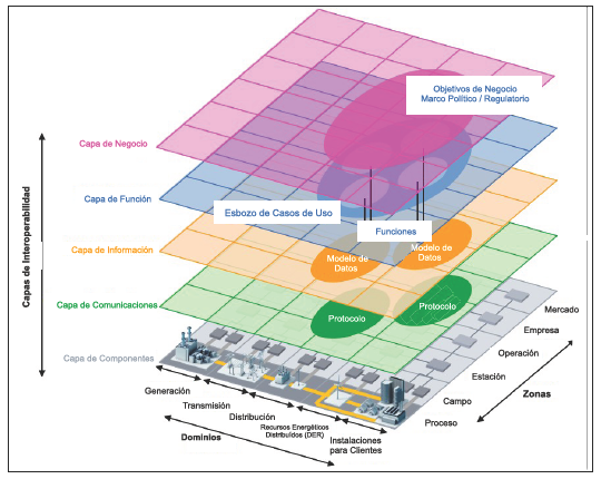 SGAM está conformado por dominios, zonas e interoperabilidad, subdivididos a su vez en niveles y capas como se describe en la Tabla 2; los dominios físicos de la red corresponden a la cadena completa de conversión de la energía eléctrica: generación, transmisión, distribución, recursos energéticos distribuidos, Distributed Energy Resources (DER, por sus siglas en inglés), e instalaciones para los usuarios. Las zonas definen los niveles jerárquicos involucrados en la gestión del sistema de energía eléctrica: proceso, campo, estación, operación, empresa y mercado. Mientras que la relación entre las zonas y los dominios, se establece mediante las capas de interoperabilidad: componente, comunicación, información, función y negocio (CEN-CENELEC-ETSI Smart Grid Coordination Group, 2014).