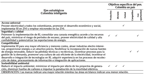 Por su parte, Colombia Inteligente es una iniciativa público-privada creada a finales de 2010, con el propósito de promover y desarrollar soluciones para el sector eléctrico que minimicen el impacto ambiental y optimicen el uso de la energía eléctrica (Cespedes, et al., 2012). A partir de empresas, instituciones y demás actores del sector energético colombiano, busca establecer de manera concertada lineamientos, políticas y estrategias para el desarrollo y fortalecimiento del sector. Dentro del “Informe de Gestión 2013”, Colombia Inteligente propone cuatro ejes estratégicos en el marco de las RI, para el desarrollo del progreso social (Comité Directivo Colombia Inteligente, 2014). La Tabla 1, describe los ejes estratégicos de Colombia Inteligente, a saber, acceso universal, seguridad y calidad, competitividad y sostenibilidad ambiental, y los relaciona con los objetivos del PEN.