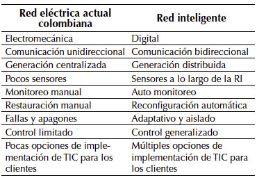 Una RI busca satisfacer la demanda de los usuarios finales a través de tecnologías digitales, que permiten un continuo monitoreo y control sobre el transporte de la energía eléctrica desde las fuentes de generación; de esta manera, las RI permiten que el sistema sea controlado eficientemente por las partes interesadas. A saber, generador, operador de red, usuario final y mercados relacionados, con el objetivo de minimizar los costos e impacto medio ambiental (Wei, Zhou y Zhu, 2009), mientras se incrementa la confiabilidad, la resiliencia y la estabilidad del sistema (International Energy Agency, 2011). La Tabla 3 realiza la comparación de las características técnicas de la red eléctrica actual colombiana frente a una RI.