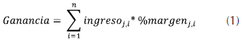 Ganancia (G). Representa el valor que, de las ventas, realmente contribuye a la organización. Resulta de multiplicar la razón de margen contributivo que la empresa tiene calculado por familia de productos en el mes, por el valor de la compra realizada por el cliente durante ese mismo mes de esa familia de productos. Después se suman todas las ganancias por familia de productos, durante todo el tiempo de análisis para cada cliente como se muestra en la ecuación (1).