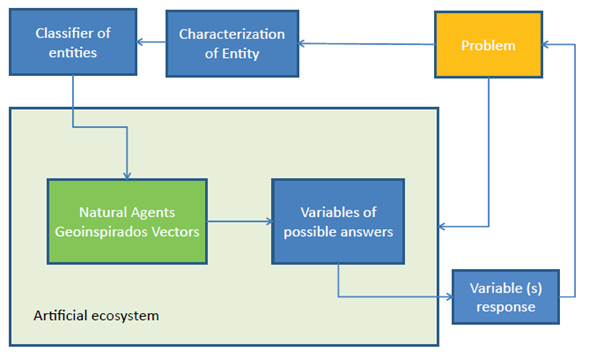 Proposed model natural vectors agents geoinspired: The AVNG may represent the environmental entity in an artificial context, where its functions are defined to find possible answers to the problem.