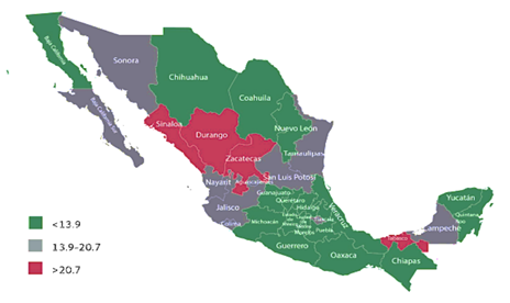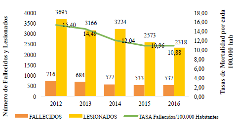 En el caso de México, el estado de Jalisco ha generado altas tasas de accidentalidad, morbilidad y mortalidad, las cuales están por encima de la media nacional mexicana respecto a estados que tienen mayor población y parque vehicular, como el Estado de México o la Ciudad de México. De acuerdo con el Secretariado Técnico del Consejo Nacional de Prevención de Accidentes (STCONAPRA), en 2015, la media de tasa de mortalidad fue de 14,6 y 13,4 defunciones por cada 100.000 habitantes en el país, mientras que en el estado de Jalisco se tuvieron tasas de mortalidad de 19,5 y 17,2. En este sentido, Ciudad de México presentó tasas inferiores, con el 8,7; casi la mitad de las presentadas por el estado de Jalisco (figura 3).