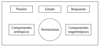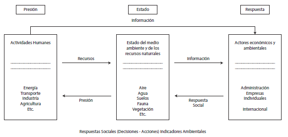 Metodológicamente, el estudio se estructura en tres fases de análisis sistémico: a) análisis del vehículo, b) análisis del usuario y c) análisis del camino. Posteriormente, se aplica los fundamentos modificados del modelo presión/estado/respuesta (PER), identificando que la presión la ejercen los componentes entrópicos intrasistémicos en el trinomio vehículo/usuario/camino, que el estado es la homeostasis del sistema urbano o, en otros términos, las condiciones de accidentalidad y mortalidad, y la respuesta es el conjunto de acciones tendientes a reducir los niveles de entropía (componentes negentrópicos). Este modelo se fundamenta en las premisas del enfoque sistémico, con aplicabilidad en problemáticas de orden medioambiental; por tanto, provee un marco descriptivo a través de un conjunto de indicadores de intervención para mitigar los impactos antrópicos ejercidos en el ambiente. Esta metodología fue implementada por la Organización para la Cooperación y Desarrollo Económico (2002), con el objetivo de evaluar el estado del medio ambiente en sus países miembros (figura 5).