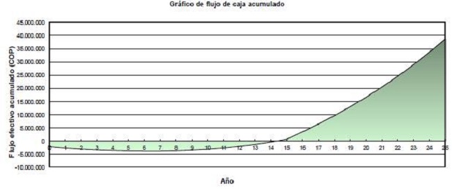 Los resultados obtenidos en RETScreen se presentan en la tabla 10, y en la figura 3 se puede ver el flujo de caja acumulado durante el tiempo de vida del proyecto.