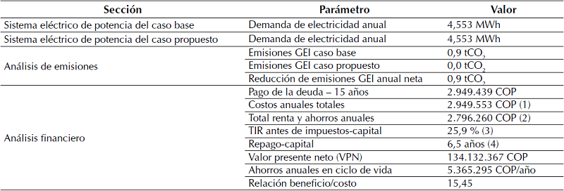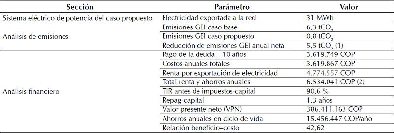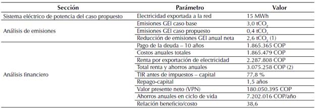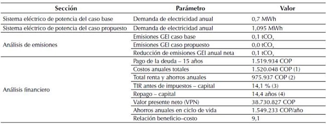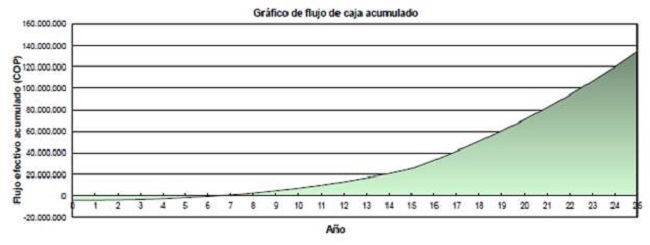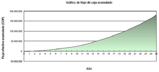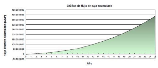 Los resultados obtenidos en RETScreen se presentan en la tabla 8, y en la figura 2 se puede ver el flujo de caja acumulado durante el tiempo de vida del proyecto.