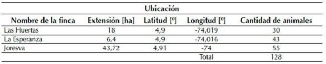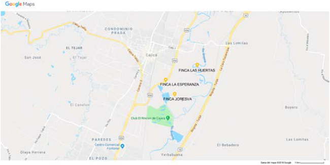 Para este caso se escogieron tres fincas aledañas dedicadas a la crianza de ganado vacuno lechero, ubicadas en el sector de Calahorra. La figura 4 muestra la ubicación de las fincas, caracterizadas por estar cerca del río Bogotá y a la Planta de Tratamiento de Aguas Residuales (PTAR); lo que asegura la disponibilidad de recurso hídrico. La tabla 11 describe las características principales de las fincas objeto del caso de estudio.