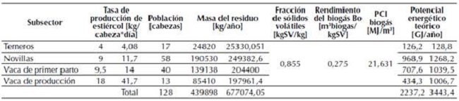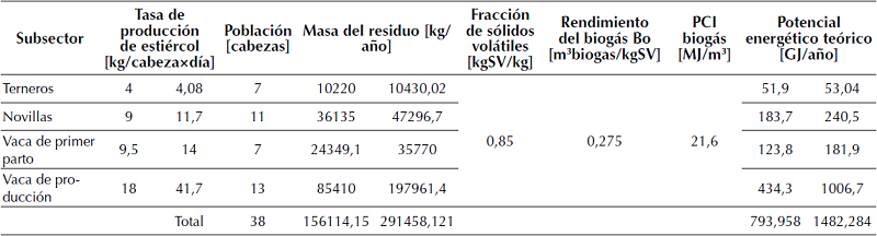 De acuerdo con la tabla 2, la cantidad de estiércol que se estima, teniendo en cuenta que el ganado no está estabulado (fincas Las Huertas y Joresva) y que el tiempo de estabulación en la finca La Esperanza es de tan solo tres horas, oscila entre los 150,65 kg/día a 231,874 kg/día. La tabla 13 presenta un valor total de producción de estiércol al año, a partir de la recolección del 100 % del residuo. Para la estimación del potencial energético técnico se considera un porcentaje de recolección del 12,5 % debido a que el ganado no se encuentra estabulado.