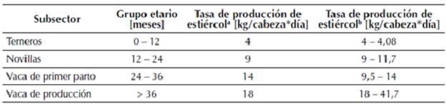 Para determinar la cantidad de biomasa residual bovina disponible, se establece una tasa de producción de estiércol según el grupo etario y la información suministrada por la Unidad de Planeación Minero Energética (UPME, 2010) y el trabajo de Gonzales et al. (2014), tal como se muestra en la tabla 2.