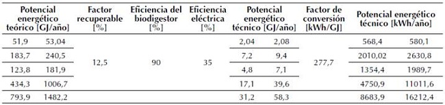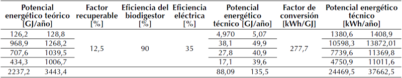 Para la estimación del potencial energético se identifican las variables necesarias para aplicar la formulación matemática propuesta en la metodología APRENDYSAGE, dichas variables comprenden el rendimiento del biogás, el poder calorífico inferior, entre otras (véase anexo 3 en Ladino y Martínez, 2016). Los resultados se presentan en la tabla 13.