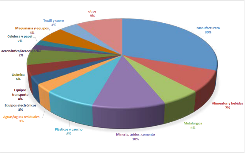De las respuestas obtenidas, el 30 % de las empresas participantes se ubican en el sector manufacturero; seguido por un 10 % en el sector de minería, áridos y cemento, y un 8 % en el sector de plásticos y cauchos (figura 1).