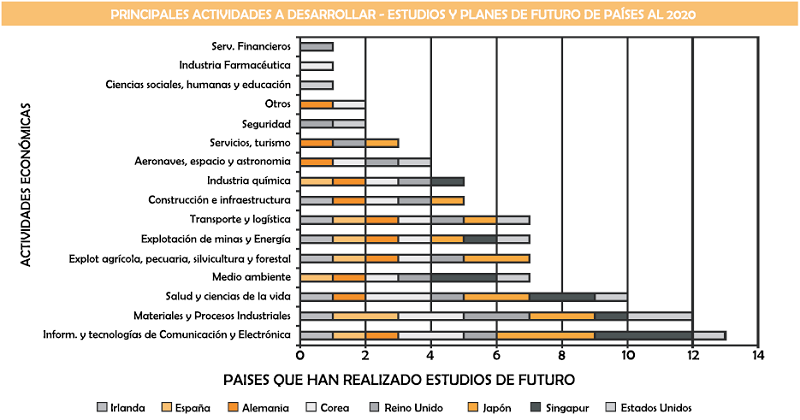 De acuerdo con el Plan estratégico del programa nacional de desarrollo tecnológico, industrial y calidad, publicado por Colciencias (2000), se realizaron investigaciones de la prospectiva en naciones en vía de desarrollo y desarrolladas (figura 6). La informática, tecnologías de la comunicación y electrónica son las actividades prioritarias para los países seleccionados (Estados Unidos, Japón, Reino Unido, Singapur, Corea, Alemania, España e Irlanda) sobre las cuales se realizaron estudios de futuro.