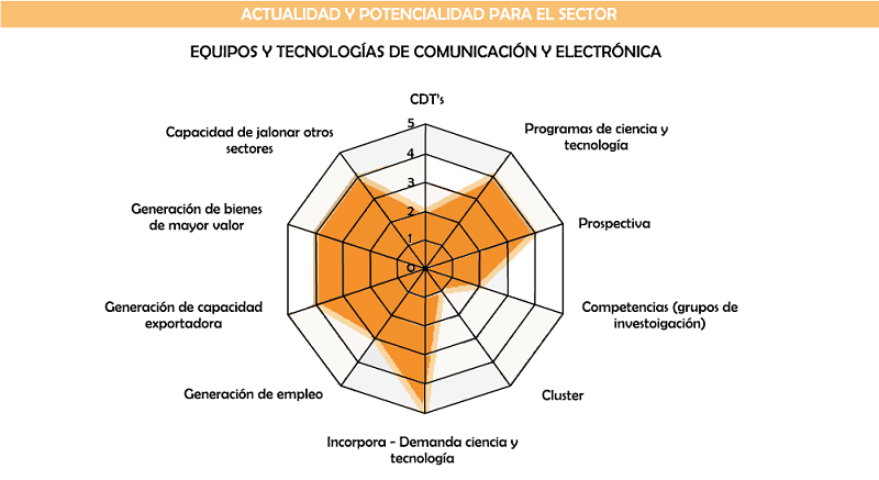 Actualmente, en Colombia, sectores como el de equipos y tecnologías de comunicación y electrónica ofrecen oportunidades muy probables para el desarrollo en esta área (figura 7) de las tecnologías de la información y la comunicación (TIC), las cuales han permitido el avance favorable en el país. Por su alta correspondencia, se dividen en dos sectores: producción de software, y producción de equipos y tecnologías de comunicación y electrónica. Para estos dos se concluyen capacidades en el ámbito regional, como Valle, Bogotá y Medellín, en aspectos como educación superior y capacidad empresarial.