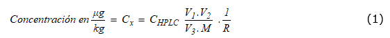 Determinar la concentración final de un analito en una matriz implica calcular una función, la cual depende de las variables de cálculo (por ejemplo, volumen de extracción, respuesta del equipo, etc.). Para el cálculo de la concentración para cualquier aflatoxina, de acuerdo con el protocolo del método (Rodríguez y Gutiérrez, 2015), se utiliza la ecuación (1). La definición de todos los términos de esta y su valor se presentan en la sección “Resultados”. Un análisis de aflatoxina implica determinar el valor de CHPLC , que es la respuesta del cromatógrafo. Todos los demás términos son constantes porque son mediciones establecidas con valor único.