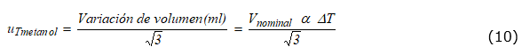 La incertidumbre por variación de temperatura se calculó según la ecuación (10), donde a es el coeficiente de dilatación volumétrico correspondiente al fluido que se mide en K-1. Por razones de extensión no se detalla su cálculo.