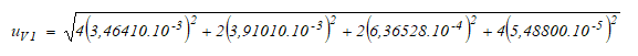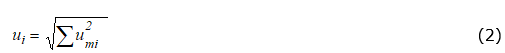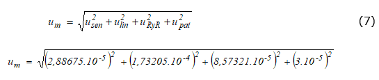 Para cada uno de los componentes (vi ) que aportan a la incertidumbre del proceso, se determinó la desviación estándar según ecuación (2) en la que umi es la incertidumbre individual de cada factor que interviene en una medición específica (linealidad, temperatura, sensibilidad, etc.), de acuerdo con la ley de propagación de incertidumbres.
