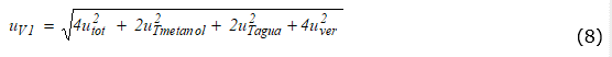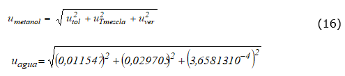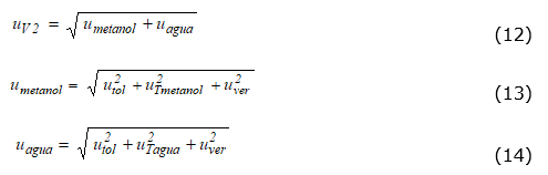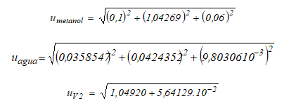 El volumen V2 , mezcla de metanol y agua, se mide con dos matraces calibrados de 200 y 50 ml respectivamente. La incertidumbre de esta medida se calcula según la ecuación (12). A su vez, las incertidumbres individuales de la medida de metanol y agua se determinaron según las ecuaciones (13) y (14).