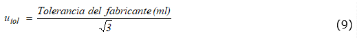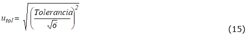 La incertidumbre por tolerancia del matraz se determinó mediante la ecuación (15):