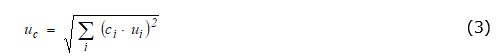 Para calcular la incertidumbre combinada, se utilizó la ecuación (3), en la que cada incertidumbre estándar se multiplicó por un coeficiente de sensibilidad ci para ponderar su aporte a la incertidumbre global.