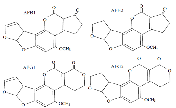 En la figura 1 se muestra la representación de las moléculas de las cuatro aflatoxinas de interés. Pertenecen a la familia de las difurano-cumarinas, y son muy similares entre ellas, con diferencias en un enlace doble y en un anillo de 5 o 6 carbonos con inclusión de oxígeno. Químicamente, son estables y resistentes a la degradación bajo procedimientos de cocción normales, y es muy difícil eliminarlas una vez que se producen.