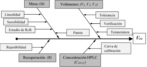En la tabla 1 se define cada uno de los términos de la ecuación (1). A partir de dicha ecuación, se definieron los componentes (vi ) identificados como aportes a la incertidumbre del proceso: M, V1, V2, V3, R y CHPLC . En la misma tabla se informan, además, los valores de los componentes utilizados más adelante para el cálculo de los coeficientes de sensibilidad. En la figura 2 se presenta el diagrama espina de pescado definido para este proceso. Todas las medidas dimensionales, se presentan en ml y g.