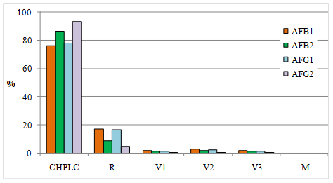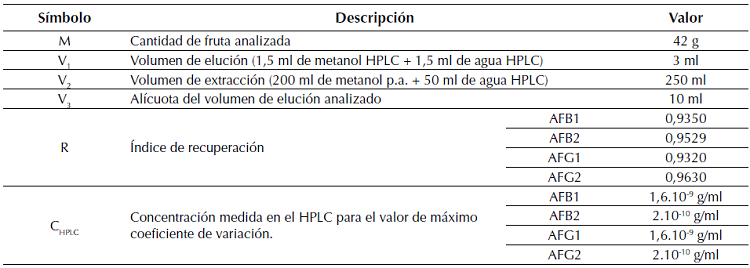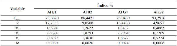 Results: Six sources of error were detected and correspond, on the one hand, to the mass measurements of the sample, extraction volumes, elution, and aliquot for “clean up” and, on the other, HPLC detection and recovery rate of the method. The calculated uncertainties for the four aflatoxins are AFB1= 0.7 mg/kg, AFB2= 0.2 mg/kg, AFG1 = 0.9 mg/kg y AFG2 = 0.3 mg/kg.