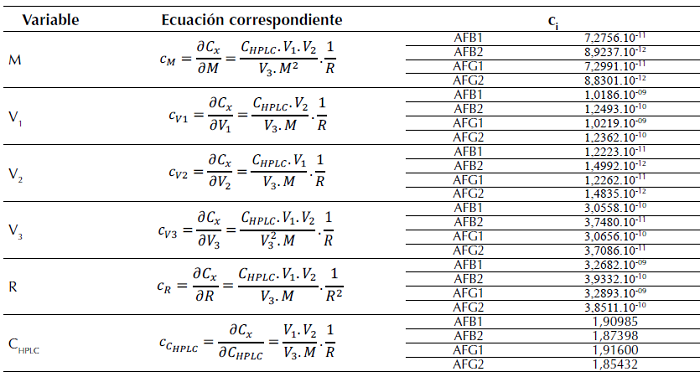 Definidas las incertidumbres individuales, se calcularon los coeficientes de sensibilidad correspondientes. En la tabla 3 se muestran las ecuaciones derivadas para su cálculo y los resultados obtenidos teniendo en cuenta los valores dados en la tabla 1.