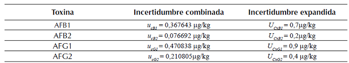 Resultados: Se detectaron seis fuentes de error, correspondientes a las mediciones de: masa de la muestra, volúmenes de extracción, elución y alícuota para clean up, detección en HPLC e índice de recuperación del método. Las incertidumbres expandidas calculadas de las cuatro aflatoxinas son AFB1= 0,7mg/kg, AFB2= 0,2mg/kg, AFG1 = 0,9 mg/kg y AFG2 = 0,3 mg/kg.