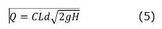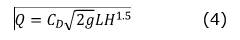 Donde, Q es el caudal descargado (m3/s), CD es el coeficiente adimensional de descarga para vertederos hidráulicos, 𝑔 es la aceleración de la gravedad (m/s2), L es la longitud efectiva en la cresta (m), 𝐻 es la carga hidráulica total incluyendo la altura de velocidad (m).