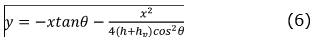 La descarga de la compuerta se define como libre cuando el chorro de aguas abajo de la puerta está expuesto a la atmosfera y el labio de la compuerta no está sumergido. En tal sentido, el flujo inmediatamente aguas abajo de la compuerta es supercrítico y un resalto hidráulico se forma aguas abajo de la compuerta (James y Young, 2001). En consecuencia, el flujo sale desde el deflector como una descarga libre hacia arriba y cae de nuevo en el río aguas abajo del extremo del aliviadero. La trayectoria del chorro se asume dependiente de la energía de flujo disponible en el deflector y del ángulo de disparo. Así la trayectoria del chorro está dada por la ecuación (6) (United States Department of the Interior, Bureau of Reclamation, 1987).