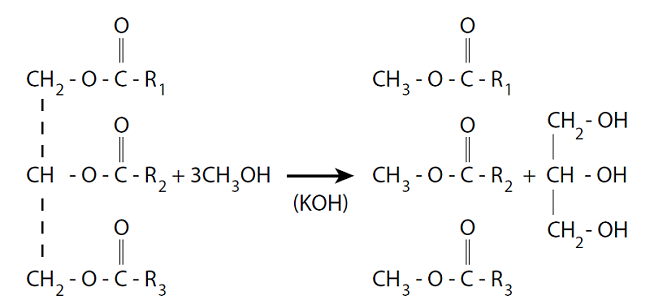 Existen diferentes métodos para la producción de biodiésel, pero el más usado es el de transesterificación de los aceites usados, cuya finalidad es separar la glicerina del aceite, reducir el punto ebullición, el punto de inflamación y disminuir la viscosidad del aceite usado (Behcet et al., 2014; Nabanita et al., 2014; Gopal et al., 2014; Adaileh y AlQdah, 2012). En la figura 1 se muestra la ecuación general del proceso de transesterificación del aceite usado. En un estudio realizado por Canesin et al. (2014), los resultados sugieren que es posible la obtención de biodiésel de aceites residuales en correspondencia con las normas de la National Association of Petroleum (ANP). Los métodos de prueba estándar para determinar las propiedades fisicoquímicas de las mezclas de biodiésel obtenidas de aceite de fritura y aceite de castor con combustible diésel permitieron establecer el cumplimiento de las especificaciones en Brasil, Europa y EE. UU. (Souza et al., 2011).