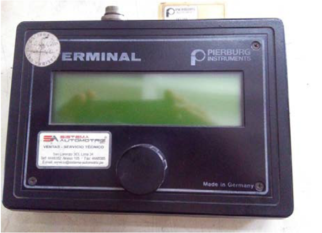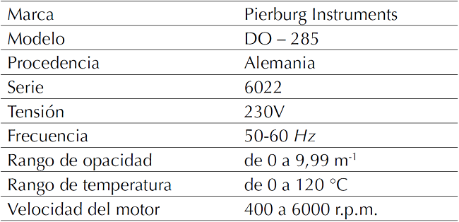 El opacímetro Pierburg Instruments (figura 3) se utilizó para medir la opacidad del humeado. Después de que el motor alcanzó su temperatura de trabajo, la sonda del opacímetro fue instalada en el tubo de escape. Las especificaciones técnicas del opacímetro se presentan en la tabla 3.